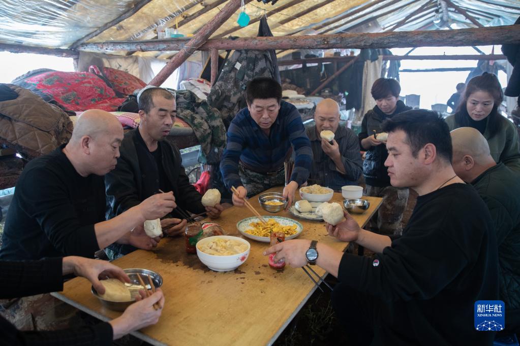 1月11日,在漠河林场管护区作业点临时帐篷内,森林抚育工人用餐。