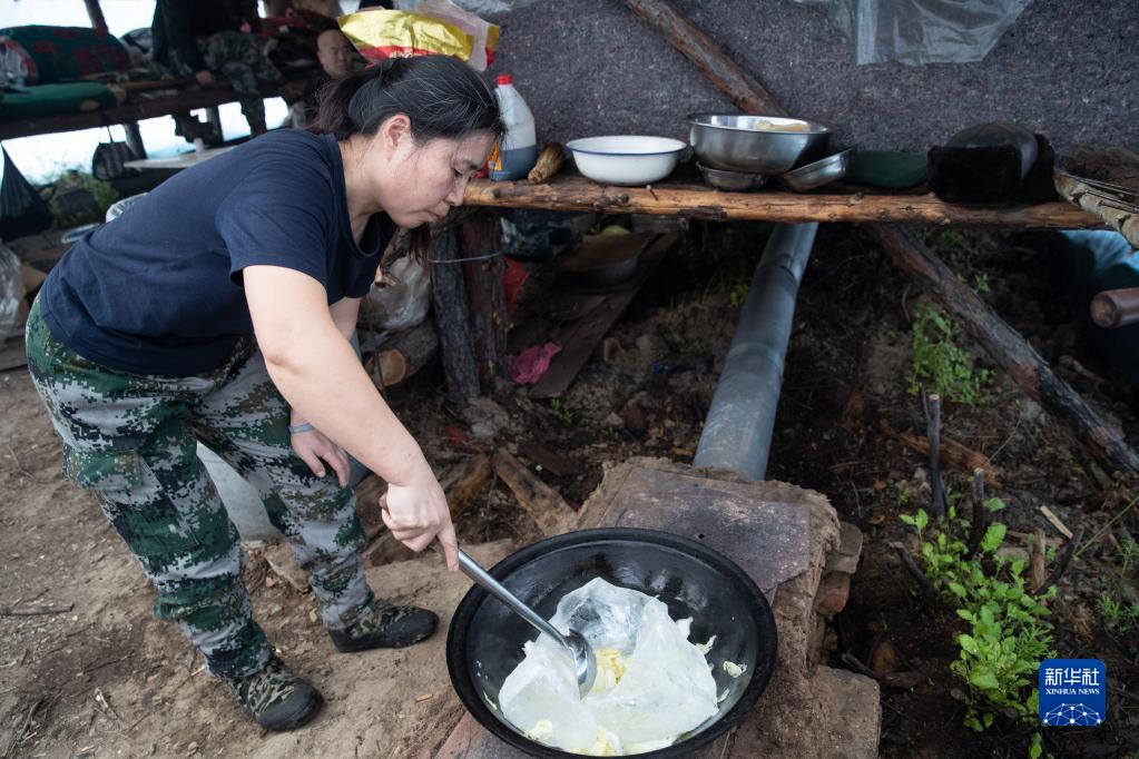 1月11日,在漠河林场管护区作业点临时帐篷内,闫秀艳在用冰块炖菜。