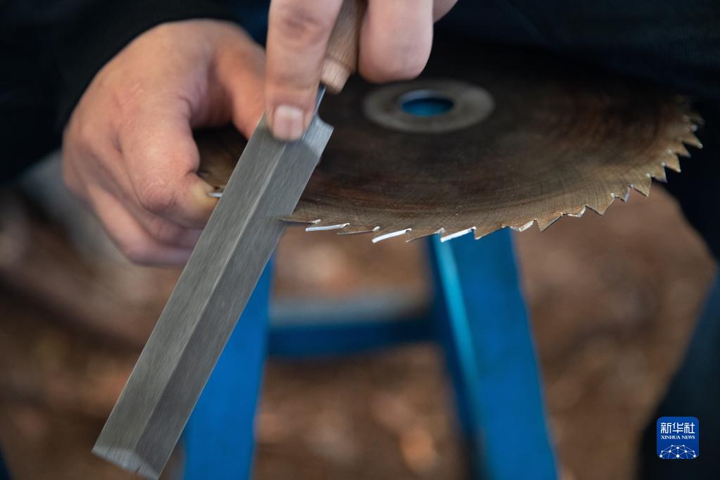 1月11日,在漠河林场管护区作业点临时帐篷内,森林抚育工人在打磨刀锯。