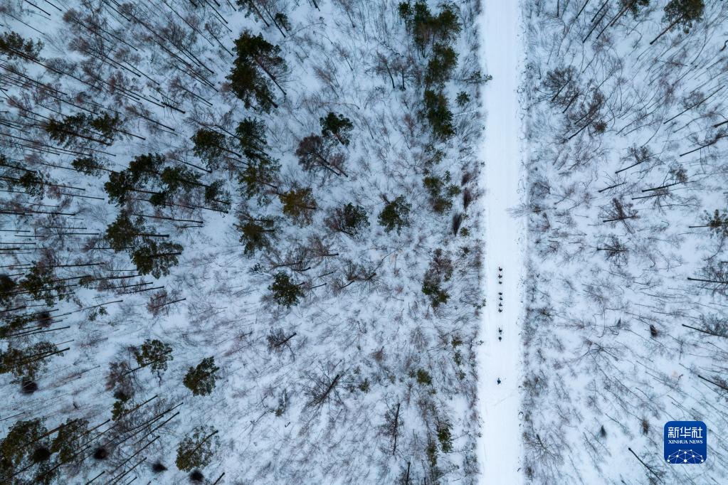 这是1月11日拍摄的森林抚育工人前往山林内的抚育作业点(无人机照片)。