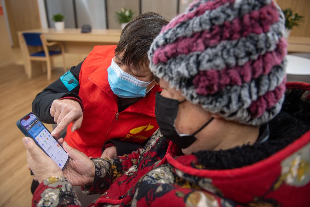 1月12日,杭州市西湖区北山街道社区志愿者指导老年居民使用“浙里办”民生服务应用。新华社记者 江汉 摄