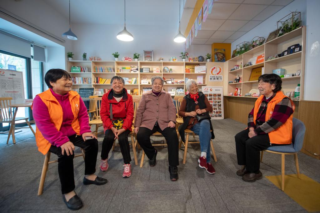 2022年11月23日,杭州市上城区南星街道白塔岭社区志愿者与老年居民在社区服务驿站内聊家常。新华社记者 江汉 摄