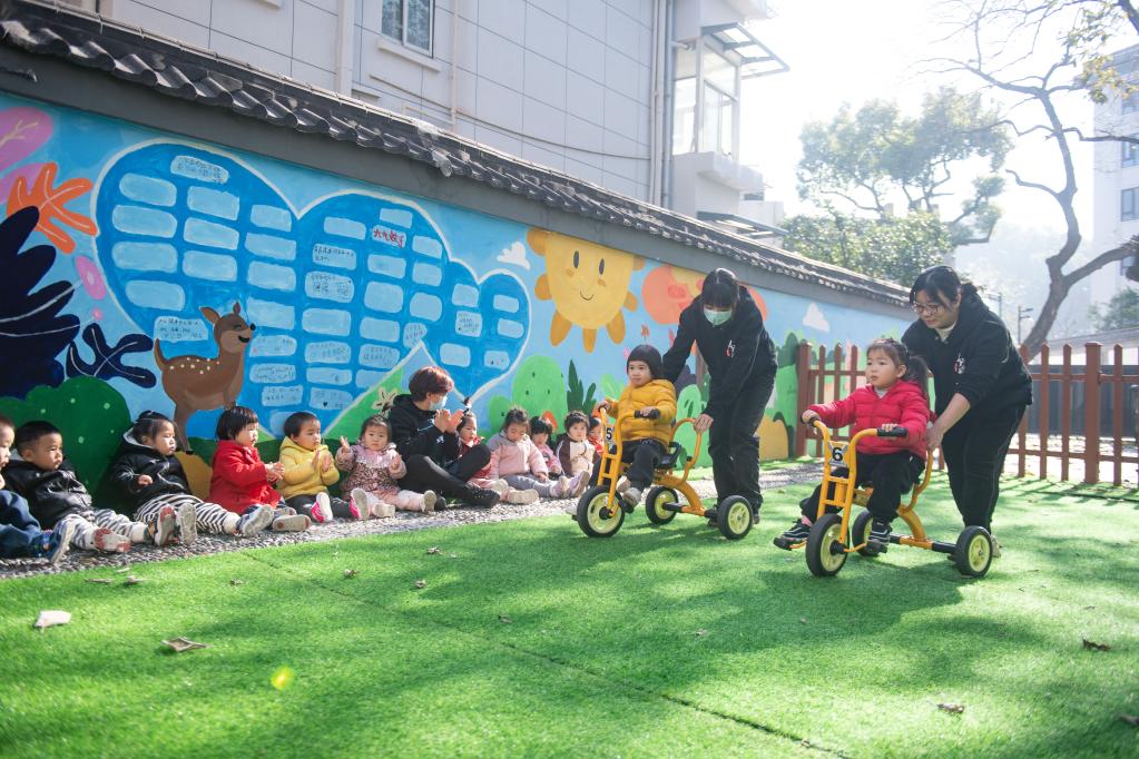 1月12日,在新建成的杭州市西湖区北山街道托育中心,老师带着小朋友们玩游戏。新华社记者 江汉 摄