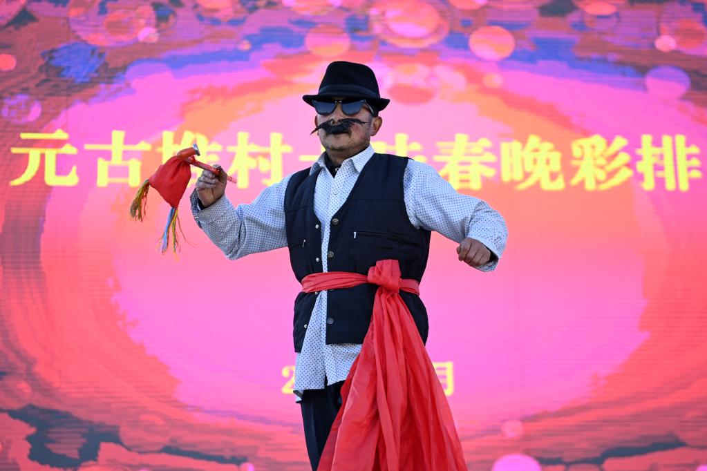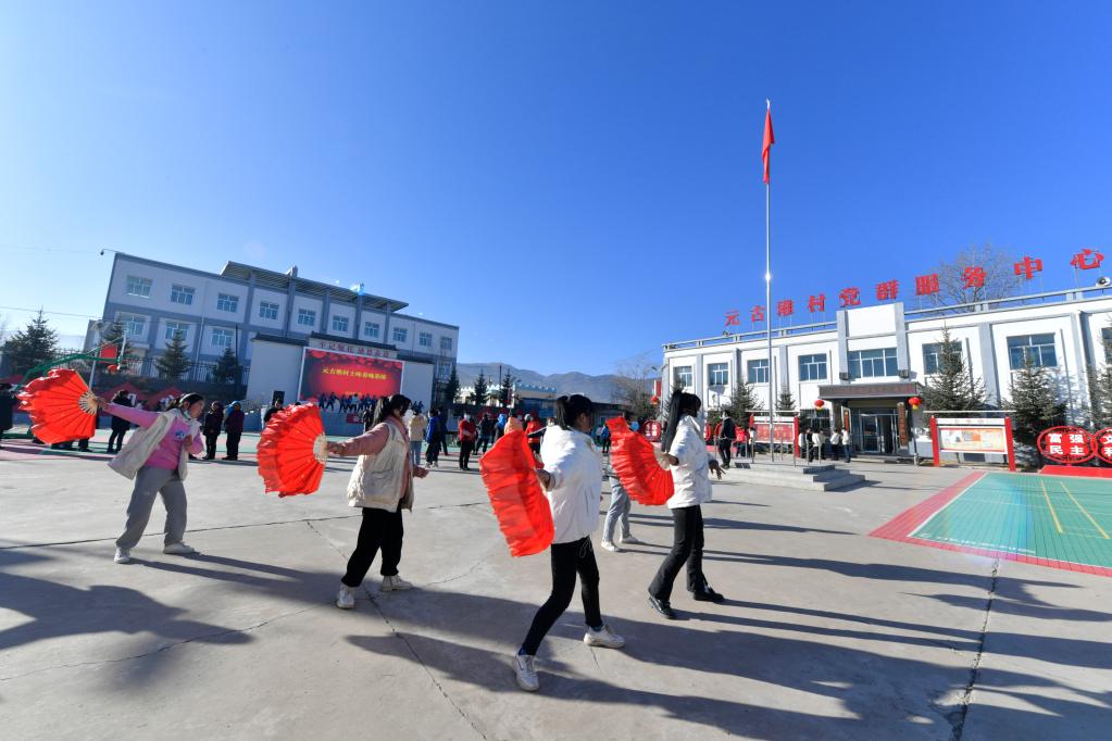 1月10日,在渭源县田家河乡元古堆村村民广场,群众排练土味春晚。新华社记者范培珅 摄