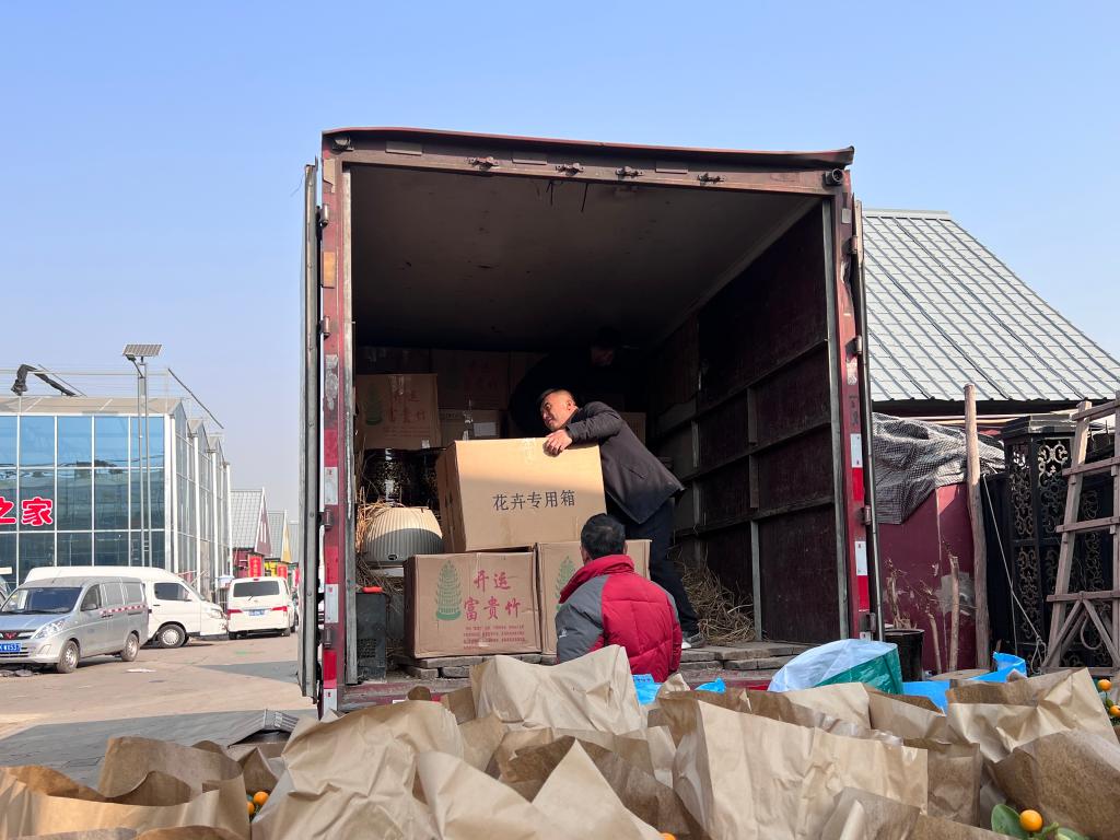 在商铺“贝贝花卉”门口,工人们正在装车一箱箱被打包好的花卉,准备运往山西吕梁市。店主王贝拿着出货单,快速清点着数量。“一天走两车,一车能装四五千盆,一天卖十几万元的货。”
