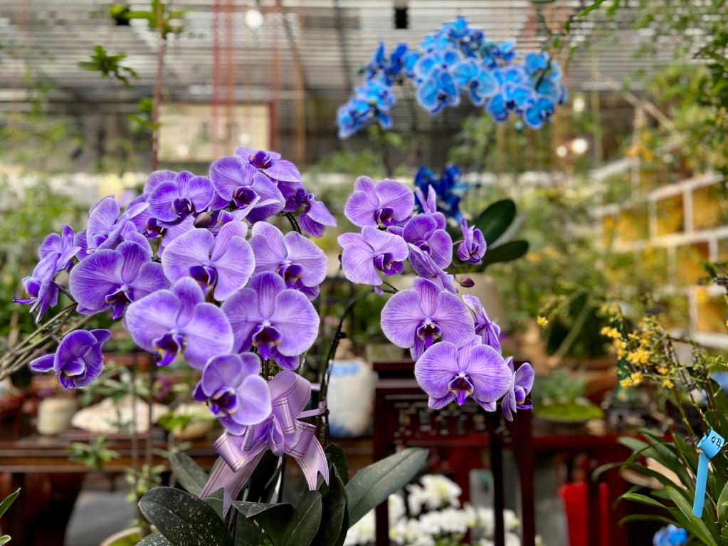 鑫龙腾山西花卉交易中心里的紫色和蓝色蝴蝶兰。新华社记者 马晓洁 摄