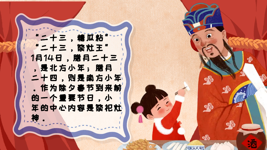 “二十三,糖瓜粘”“二十三,祭灶王”,1月14日,腊月二十三,是北方小年;腊月二十四,则是南方小年。作为除夕春节到来前的一个重要节日,小年的中心内容是祭祀灶神。