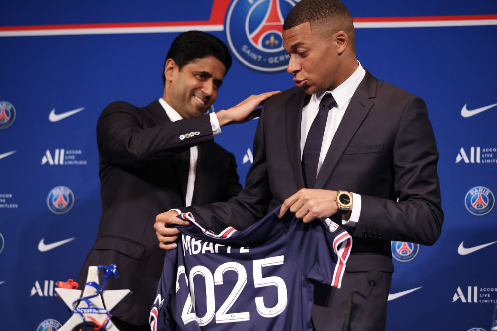 ↑2022年5月23日,在法国巴黎王子公园球场,姆巴佩(右)与巴黎圣日耳曼俱乐部主席纳赛尔出席与巴黎圣日耳曼俱乐部续约的新闻发布会。