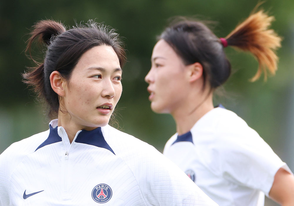 ↑2022年9月16日,租借加盟巴黎圣日耳曼女足的中国女足国脚杨莉娜(左)、李梦雯在位于巴黎近郊布日瓦勒的训练基地参加赛前训练。
