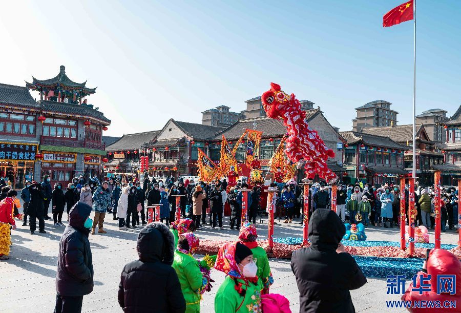 1月14日,呼和浩特,民间艺人在塞上老街年货节开幕式上表演舞狮。新华网发 (丁根厚摄)