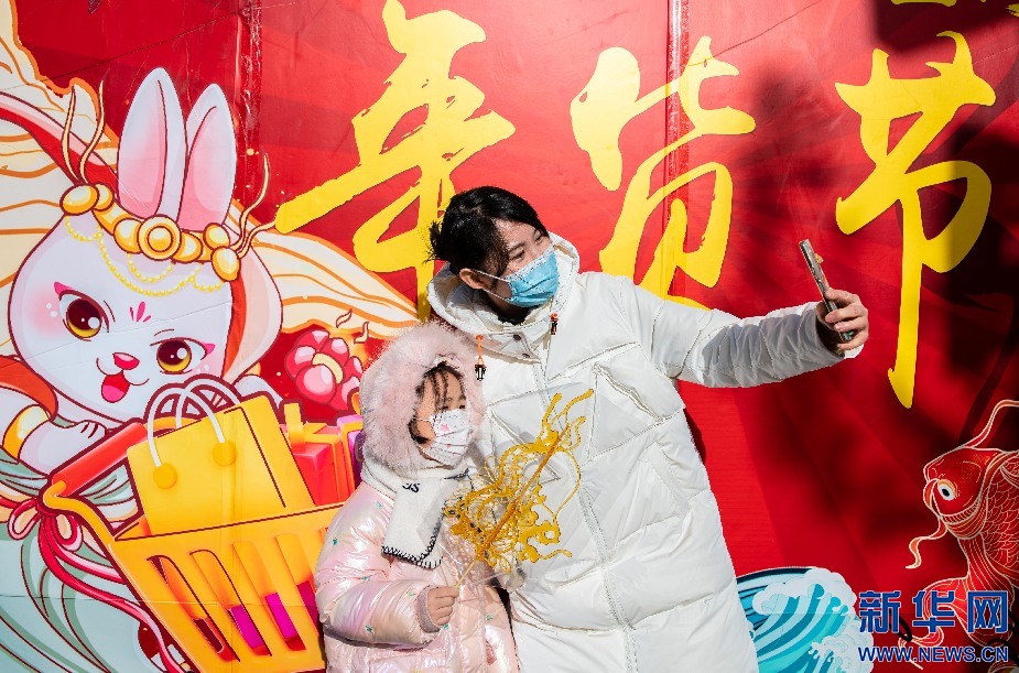 1月14日,呼和浩特,家长陪伴孩子在塞上老街年货节上选购糖画后拍照打卡。新华网发 (丁根厚摄)