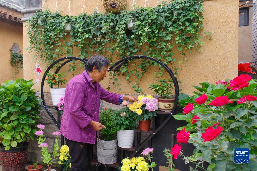 2020年8月30日,在河北省阜平县骆驼湾村,村民唐宗秀在打理院子里的花草。新华社发(李玉亮 摄)