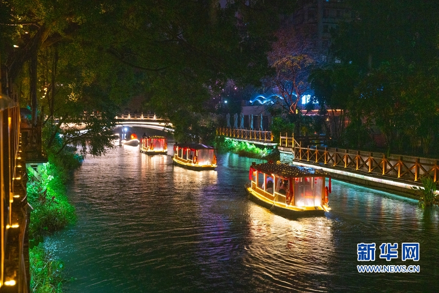 新华网福州1月15日电(蒋巧玲)14日晚,“福佑闽水 新春寻福”水岸联动民俗主题演艺活动在福州市白马河-东西河水域举行。在西水关码头,一艘新型内河龙舟和四艘内河游船在锣鼓弦乐声中启航,一场集合了传统舞狮、“茶亭十番音乐”等传统民俗表演的“寻福”活动,在福州内河两岸展开。