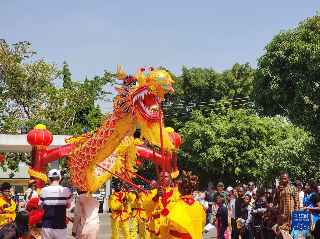 随着长长的舞龙踩着鼓点进入大院场地,现场气氛被推向高潮。十几名尼日利亚青年表演的舞龙赢得观众阵阵掌声。