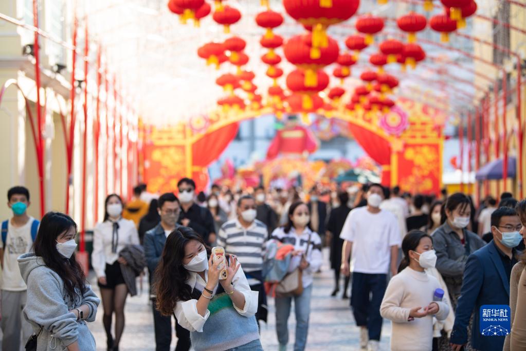 1月14日,游客在澳门大三巴牌坊前手信街游览。新华社记者 张金加 摄