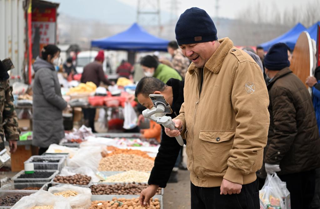 市民在西路庄大集上直播。(新华社记者李然 摄)