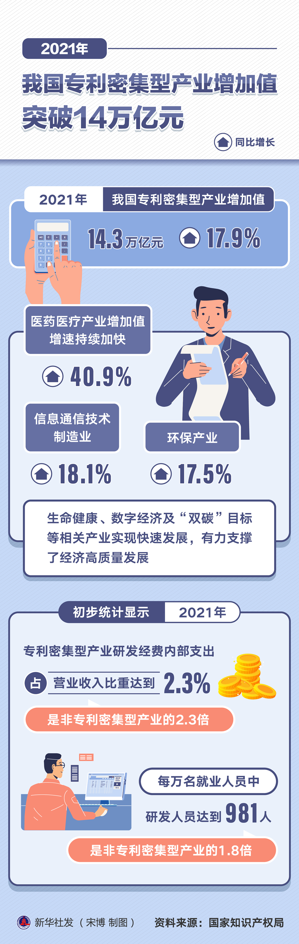 初步统计显示,2021年,专利密集型产业研发经费内部支出占营业收入比重达到2.3%,是非专利密集型产业的2.3倍;每万名就业人员中研发人员达到981人,是非专利密集型产业的1.8倍。