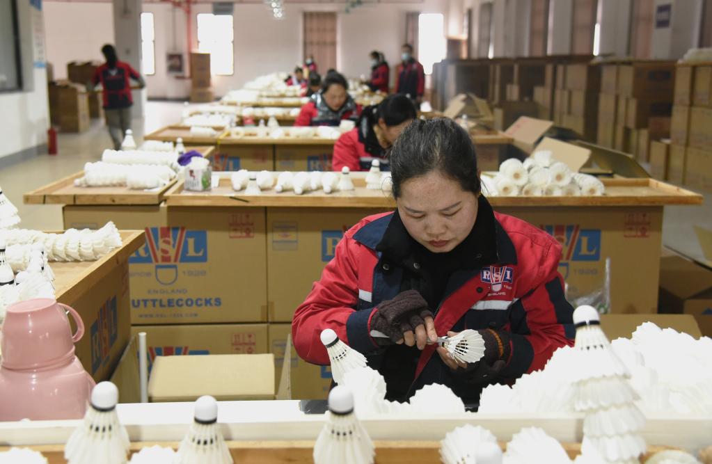 羽毛球生产包括洗毛、晒毛、分级、插球、成品全检等38道工序,几乎每道工序都需要工人严格把控。家在附近的40岁工人龙竹香自2018年起就到园区上班,工作岗位是成品全检。她说,在家门口就能稳定就业,还能学习到技术,“很是满意”。