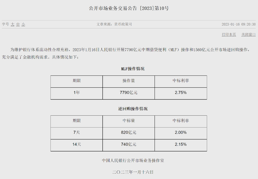 为维护银行体系流动性合理充裕,1月16日中国人民银行开展7790亿元中期借贷便利(MLF)操作和1560亿元公开市场逆回购操作,充分满足了金融机构需求,中标利率均与前次持平。