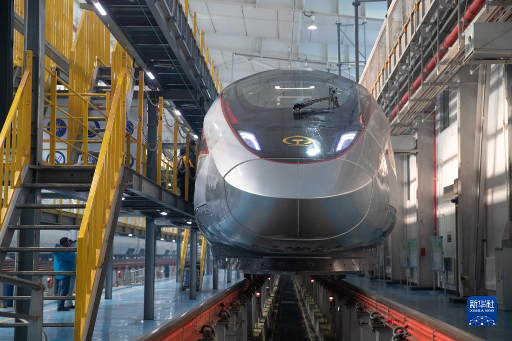 这是停靠在中国铁路哈尔滨局集团有限公司哈尔滨动车段检修车间内的CR400BF-GZ型复兴号高寒智能动车组(1月16日摄)。 新华社记者 张涛 摄