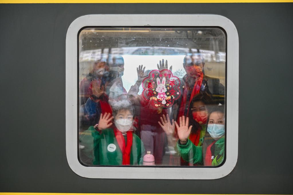 乘坐K1268次列车的乘客在车上挥手。新华社记者 周义 摄