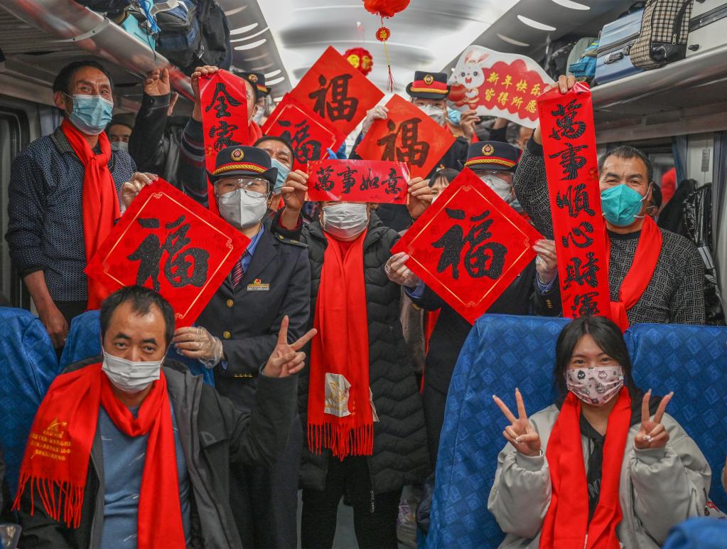 乘客与工作人员在列车上的合影。新华社记者 周义 摄