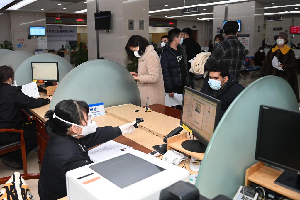 1月11日,外国客商在义乌市公安局出入境管理局办事大厅办理业务。新华社记者 黄宗治 摄