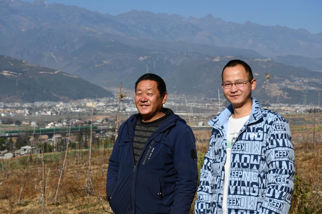 “90后”越西小伙郝文忠(右一)和“70后”父亲郝华星(左一)在苹果地里,一列“绿巨人”从身后驶过。新华社记者谢佼 摄