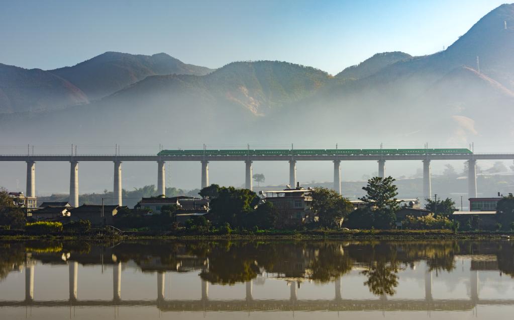 复兴号驶过新成昆铁路沙坝安宁河特大桥。(受访者供图)
