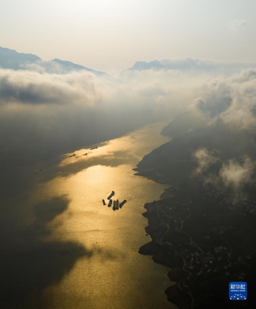 1月18日,船舶行驶在长江三峡湖北省宜昌市秭归县水域(无人机照片)。
