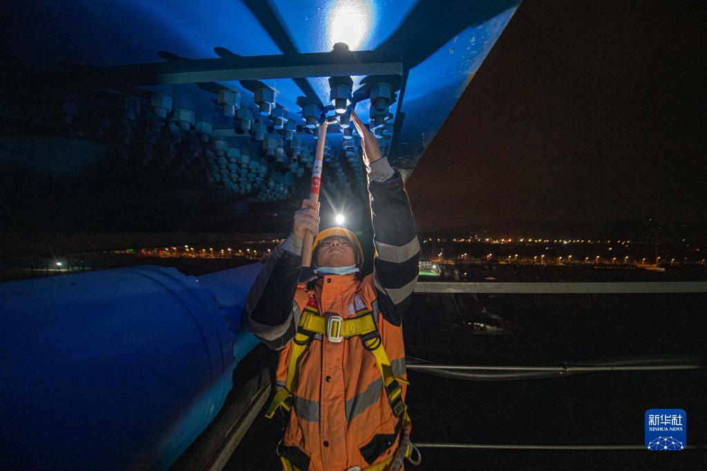 近日,浙江省迎来降温天气。铁路宁波工务段椒江桥隧工区的工人们利用夜间高铁线路的“天窗期”,顶着冬夜的寒风对杭台高铁椒江特大桥进行全方位检查,确保线路安全。