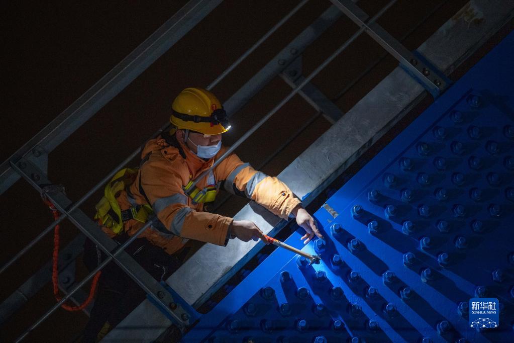 近日,浙江省迎来降温天气。铁路宁波工务段椒江桥隧工区的工人们利用夜间高铁线路的“天窗期”,顶着冬夜的寒风对杭台高铁椒江特大桥进行全方位检查,确保线路安全。
