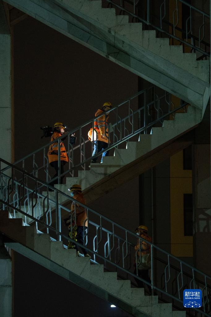 1月17日夜,铁路工人沿着检修通道攀登上杭台高铁椒江特大桥桥面。