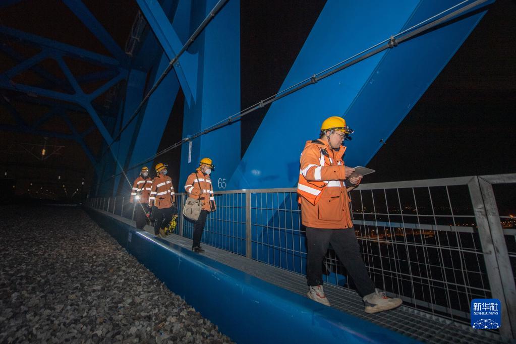 近日,浙江省迎来降温天气。铁路宁波工务段椒江桥隧工区的工人们利用夜间高铁线路的“天窗期”,顶着冬夜的寒风对杭台高铁椒江特大桥进行全方位检查,确保线路安全。