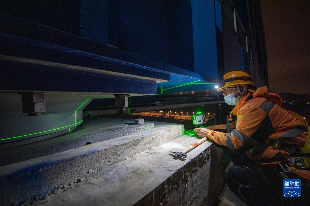 1月18日凌晨,铁路工人利用水平仪检查杭台高铁椒江特大桥桥墩。