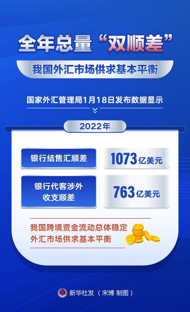 新华社北京1月18日电(记者刘开雄)国家外汇管理局1月18日发布数据显示,2022年,银行结售汇顺差1073亿美元,银行代客涉外收支顺差763亿美元,我国跨境资金流动总体稳定,外汇市场供求基本平衡。