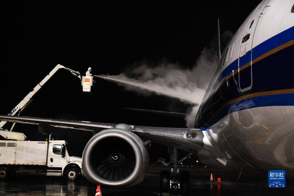 1月17日晚,在贵阳龙洞堡国际机场,南方航空的机务人员进行除防冰作业。