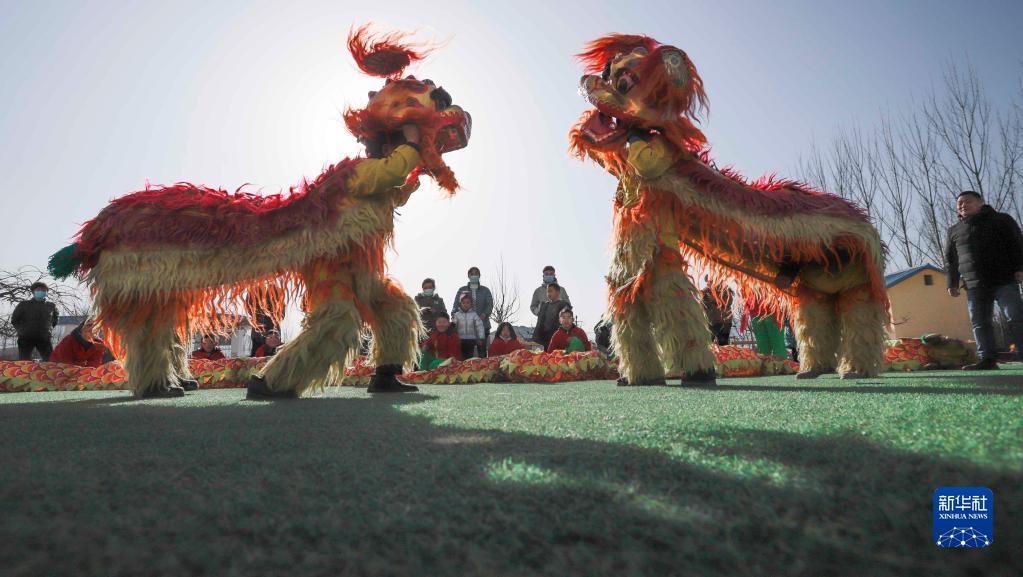1月18日,遵化市建明镇穆家庄村的民间艺人在表演舞狮。