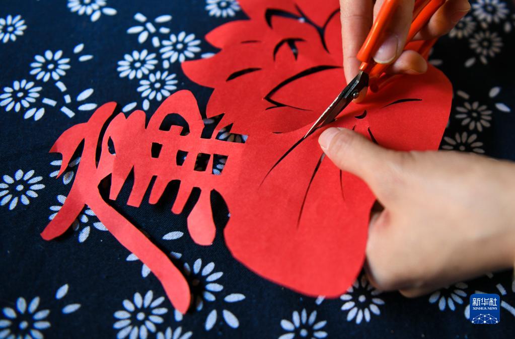1月18日,在常宁市庙前镇中田古村,常宁市剪纸非遗传承人展示剪纸技艺。