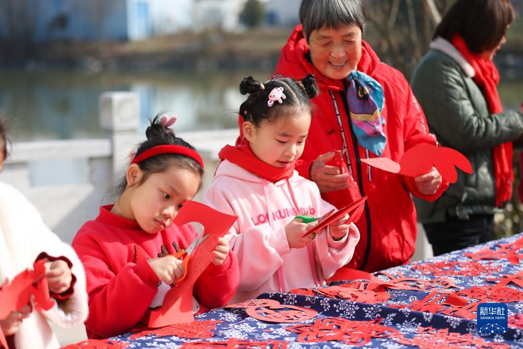 1月19日,在浙江省湖州市德清县洛舍镇三家村,孩子们在当地举行的文化迎新春活动上制作生肖“兔”剪纸作品。