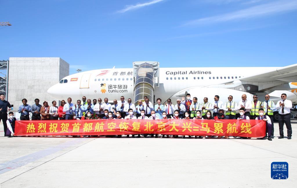 中国驻马大使王立新和马尔代夫旅游部长毛素姆等中马双方人员参加了欢迎仪式,并与机组人员、游客代表合影留念。