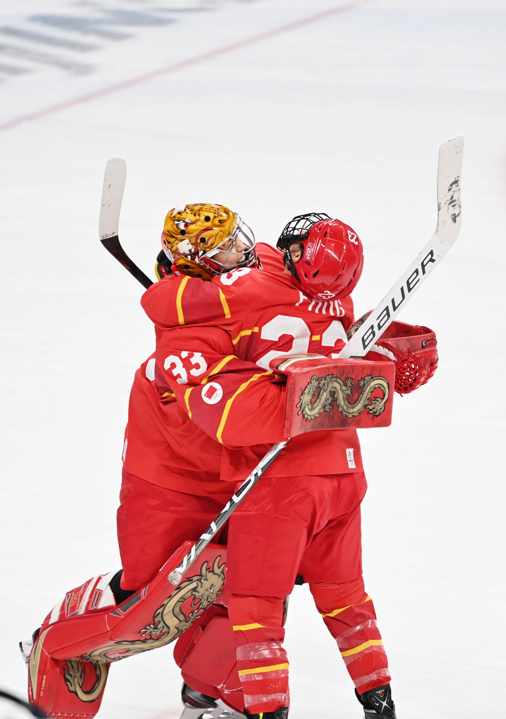 2022年2月6日,中国队守门员周嘉鹰 (左) 赛后和队友拥抱庆祝胜利。