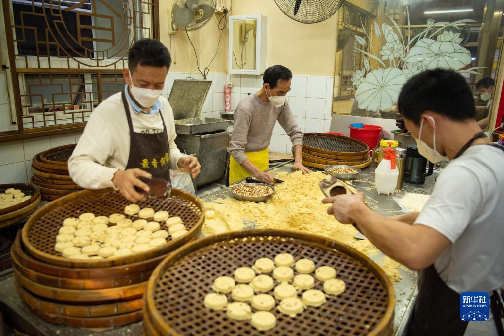 1月18日,澳门“最香饼家”员工在制作手工炭烧杏仁饼。新华社记者 张金加 摄