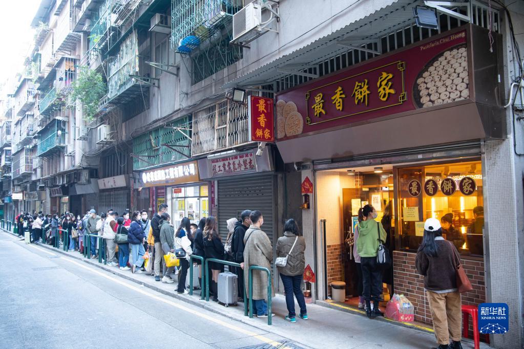 1月18日,游客在澳门“最香饼家”店外排队购买手工炭烧杏仁饼。新华社记者 张金加 摄