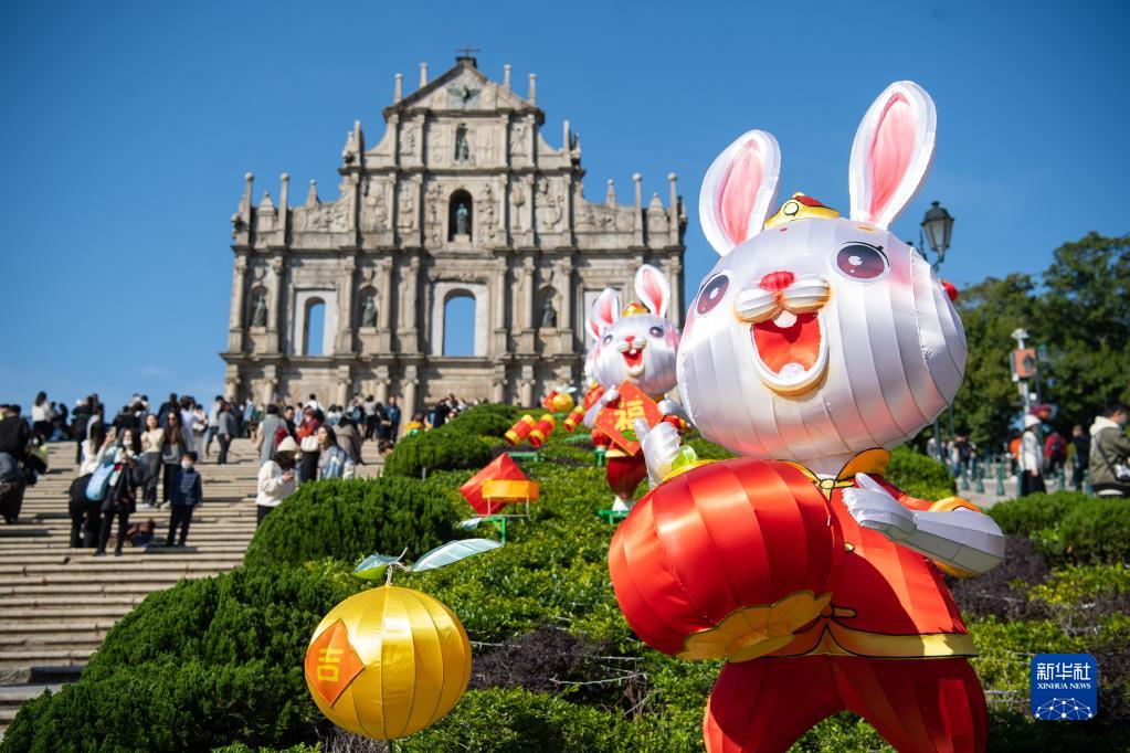 大三巴、官也街、妈阁庙……澳门的热门旅游地标处水泄不通。大三巴牌坊前,五只身穿贺年服饰的“玉兔”迎客,与牌坊互相辉映,参观的人群几乎站满了每级台阶。