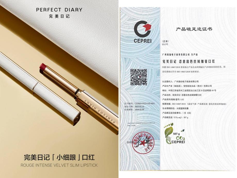如今,“小细跟”口红的碳足迹证书掀开了国内美妆碳足迹认证的新篇章。2021年,第三方权威检测机构对完美日记“小细跟”口红进行了产品碳足迹评估工作,根据证书显示,1支完美日记小细跟口红(色号为L02、L04)的碳足迹为507g二氧化碳当量。(当量是指与特定或俗成的数值相当的量)