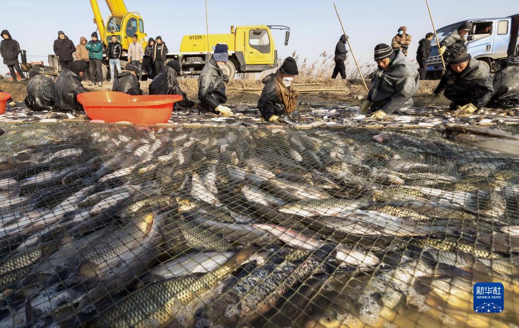 连日来,河北省唐山市丰南区的水产养殖户们忙着在池塘内破冰捕鱼,以供应春节市场。