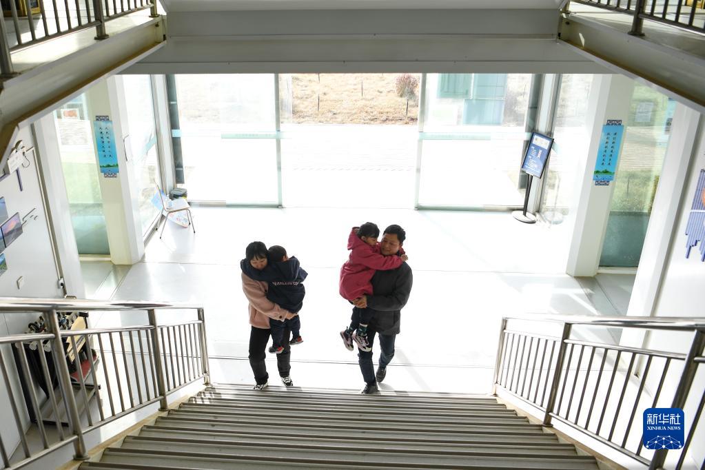 1月19日,李辉和妻子抱着孩子们在项目部内行走。