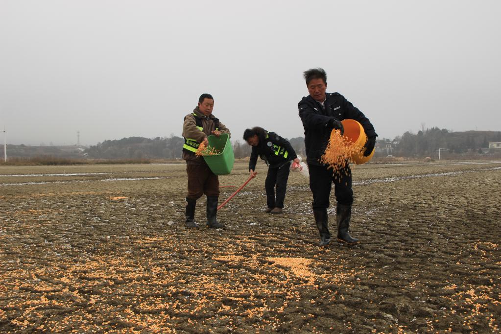 刘广惠(右一)和同事们在贵州草海国家级自然保护区内给候鸟投食。(受访者供图)