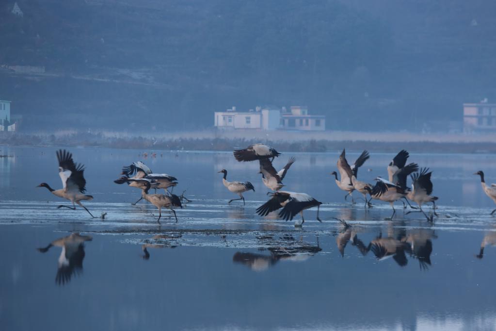 2022年11月中旬首批黑颈鹤飞抵草海越冬,目前,在草海越冬的黑颈鹤已达2588只,加上灰鹤、斑头雁、白鹭、东方白鹳等,草海越冬候鸟总数超10万只。
